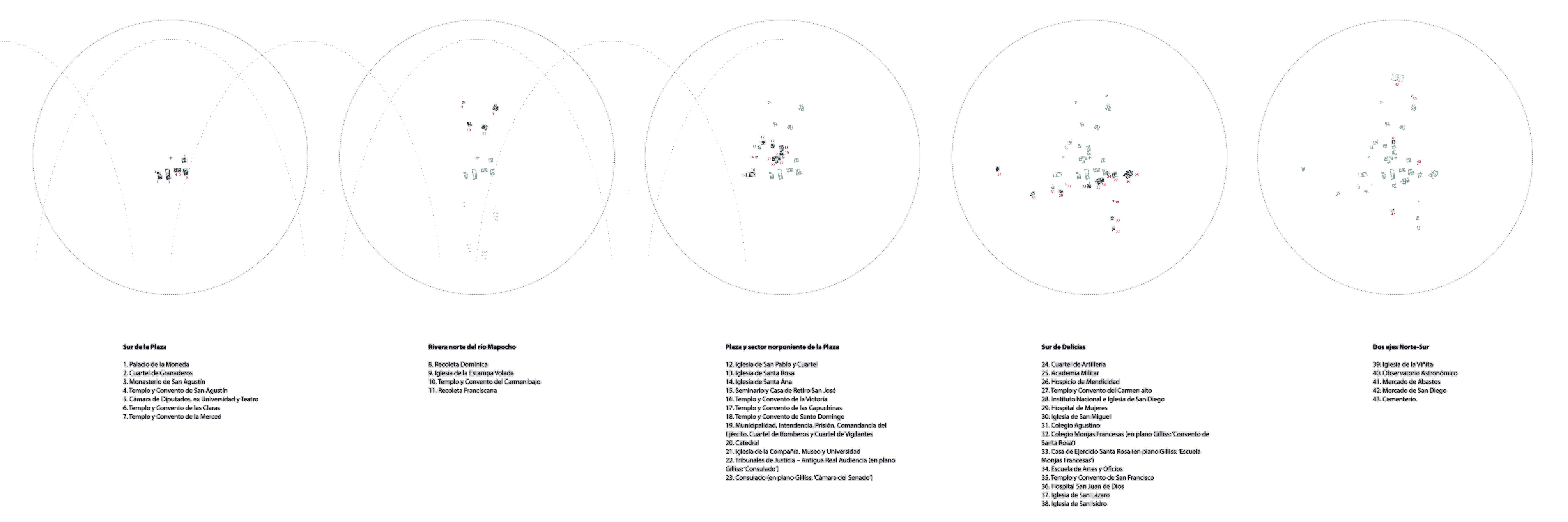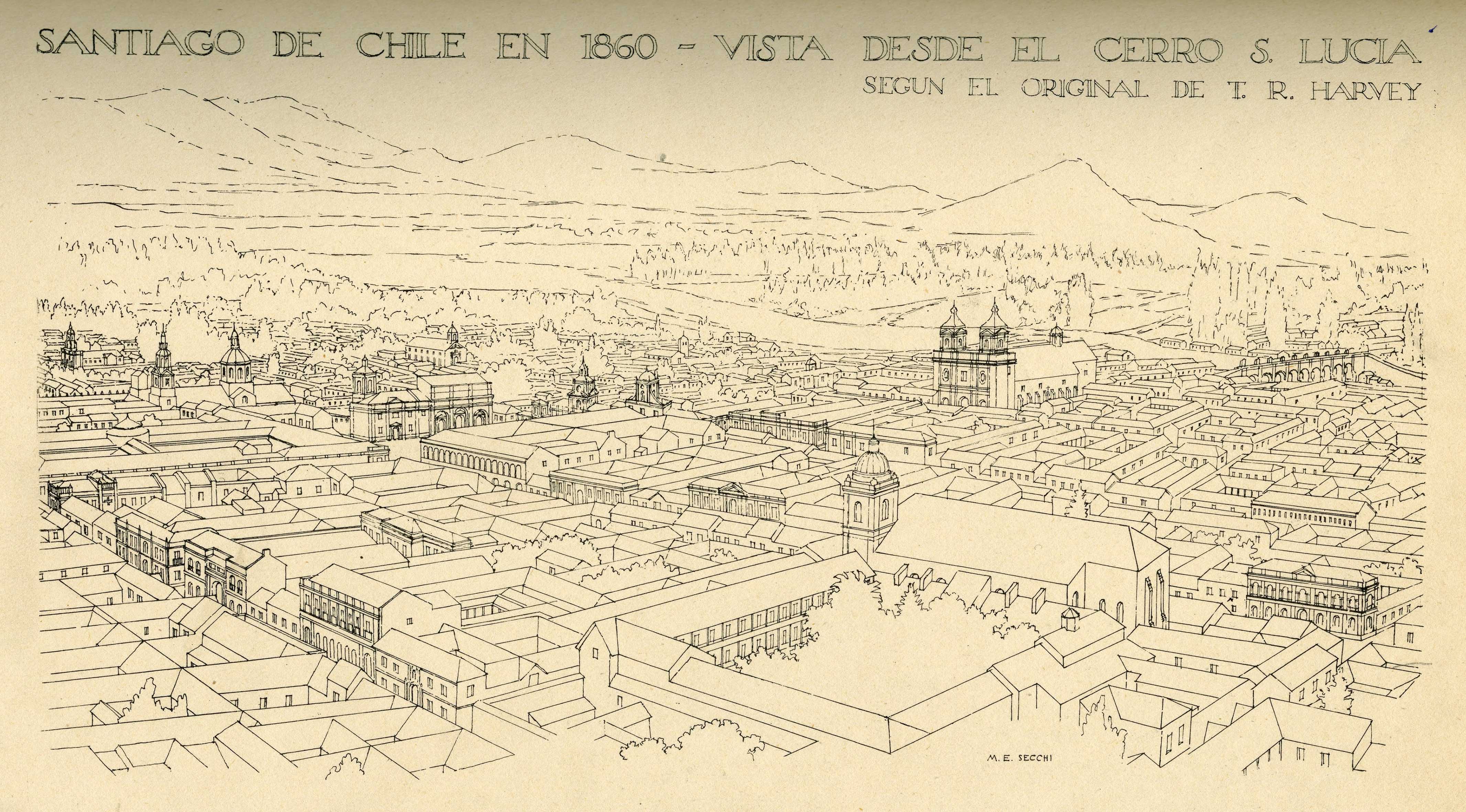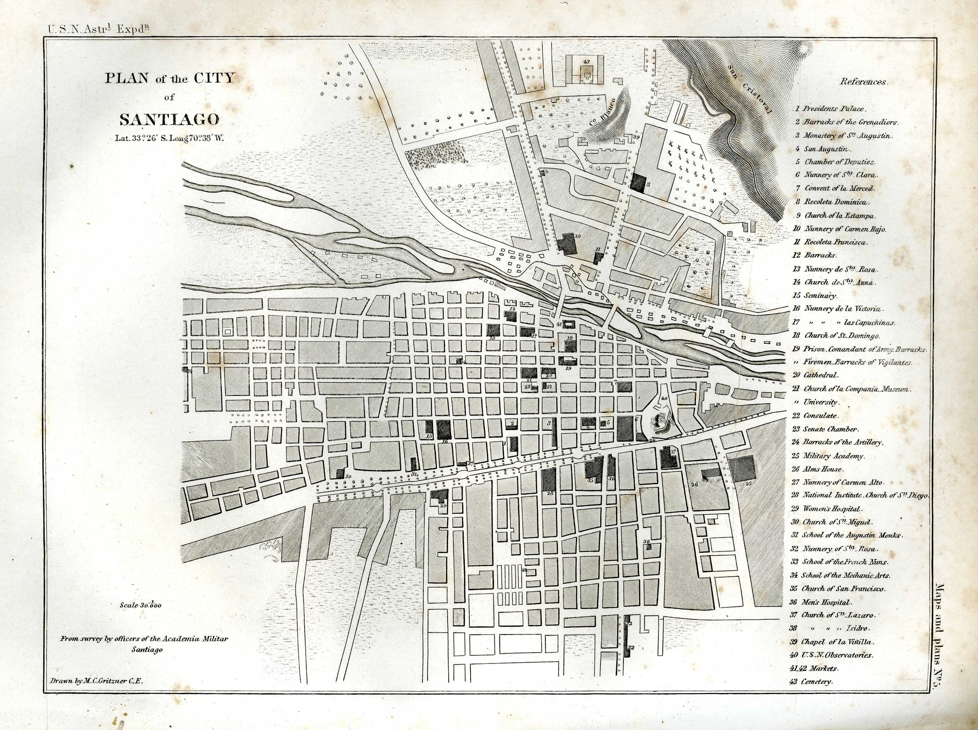 Este artículo analiza tres registros de Santiago de Chile producidos en torno a 1850 por la expedición naval astronómica norteamericana al mando del teniente James Melville Gilliss: una vista panorámica, captada desde el cerro Santa Lucía, un plano de la planta de la ciudad y un texto. El propósito de este análisis es identificar la mirada urbana que —pensamos— subyace en estos registros. Con este fin, se estudia su organización en términos de imágenes y se las pone en relación con otros registros de la época para comprobar sus grados de verosimilitud. Con ello se intenta indagar en la capacidad que tienen ciertas imágenes para penetrar en el conocimiento de aquello que pretenden representar, en este caso, una ciudad específica. Capacidad que puede asociarse con la noción de inteligir, que denota la aprehensión de la estructura subyacente en el espacio. ¿Cómo vieron y comprendieron Santiago de Chile los miembros de la expedición astronómica desde el observatorio que instalaron en lo alto del cerro Santa Lucía? En primer término, guiados por el nuevo ethos de la práctica científica: la observación; sumado al estricto rigor metodológico y al soporte instrumental de su propia disciplina, la astronomía. Mas no por ello fueron insensibles a la hora de identificar otras formas de orden, ni menos indiferentes a modos más sutiles de organización, pues también entendieron que el orden que comenzaba a exhibir la capital de la naciente República era consecuencia de aquel que estaban estableciendo las nuevas instituciones en su despliegue sobre el territorio, a través del cual, como sabemos hoy, se daba forma a un nuevo tipo de espacio.