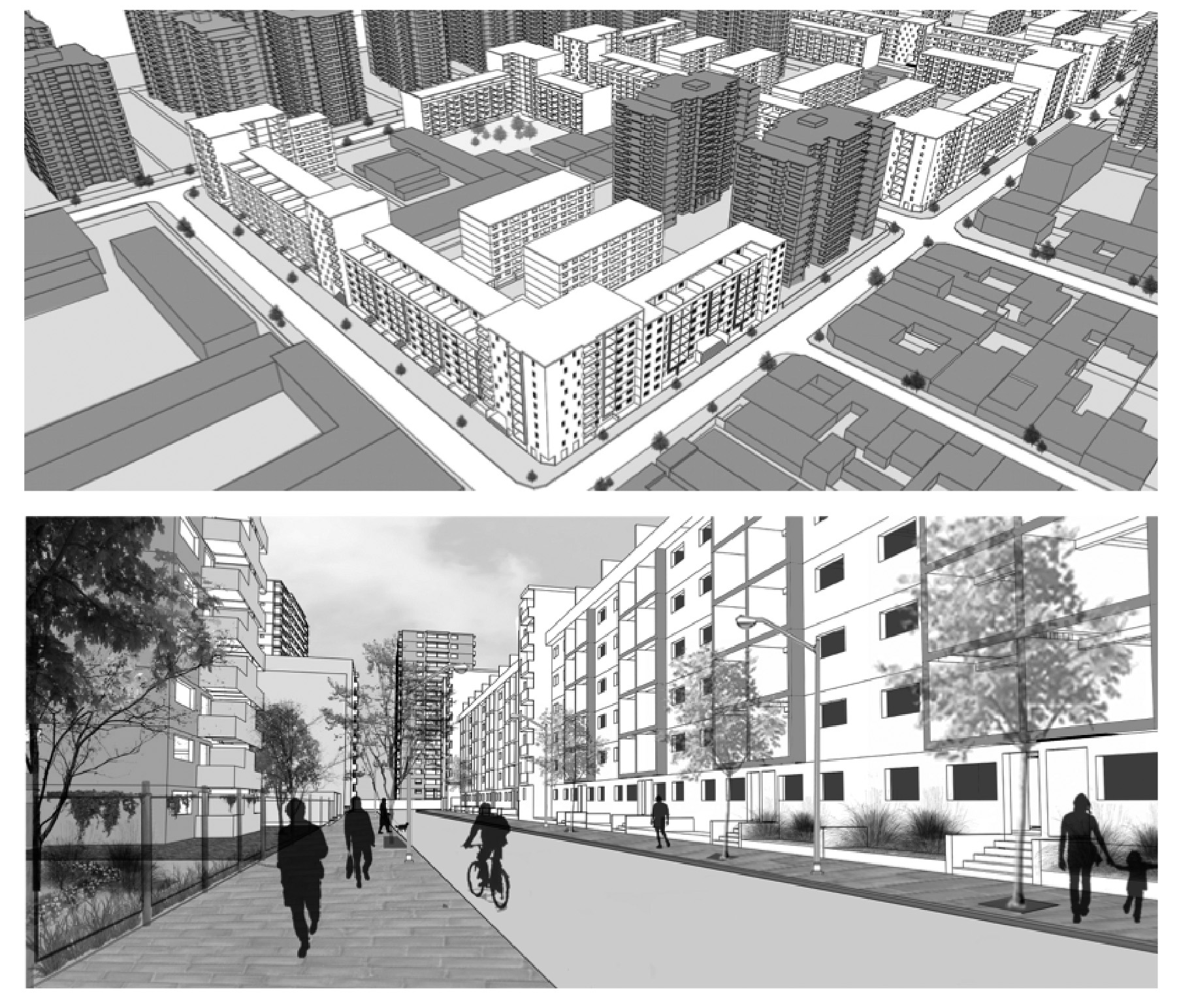 El presente trabajo estudia la factibilidad de un modelo alternativo a esta forma de densificación, una que fomente la vitalidad urbana y una relación más estrecha entre el espacio privado y el público. A partir de un registro exhaustivo de lo construido en los últimos diez años en un sector de la comuna de San Miguel, se caracterizaron las tendencias de desarrollo inmobiliario en términos de altura de las torres, tipo y tamaño de los departamentos y formas de relación con la calle. Esto permitió definir un escenario tendencial para el sector. Además, se diseñó una propuesta alternativa que, disminuyendo la constructibilidad en un 18%, genera una relación más estrecha con la calle, disminuye las alturas en forma significativa, densifica el interior de la manzana y aumenta el comercio de escala barrial. Los escenarios tendencial y alternativo fueron mostrados y discutidos con postulantes a los programas S 49 y DS 50 del Ministerio de Vivienda y Urbanismo, Minvu, en dos grupos focales.