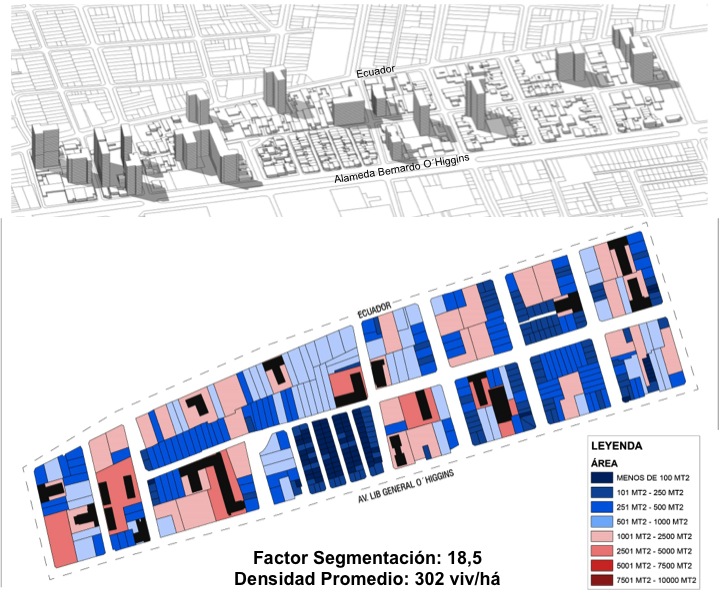 Este trabajo analiza el impacto de la densificación residencial intensiva en el tejido urbano de barrios seleccionados del Área Metropolitana de Santiago (AMS). Se explora el efecto de “segmentación” propuesto por Diez (1996), el cual conduce a un tejido constituido por tipos edificatorios incompatibles entre sí y de distintas intensidades de explotación del suelo. A partir de un enfoque cuantitativo, se analizan los indicadores de densidad residencial neta, coeficiente de constructibilidad y su desviación estándar. A su vez, se propone un nuevo indicador, el factor de segmentación, que combina la superficie edificada correspondiente a torres residenciales y el porcentaje de predios densificados.