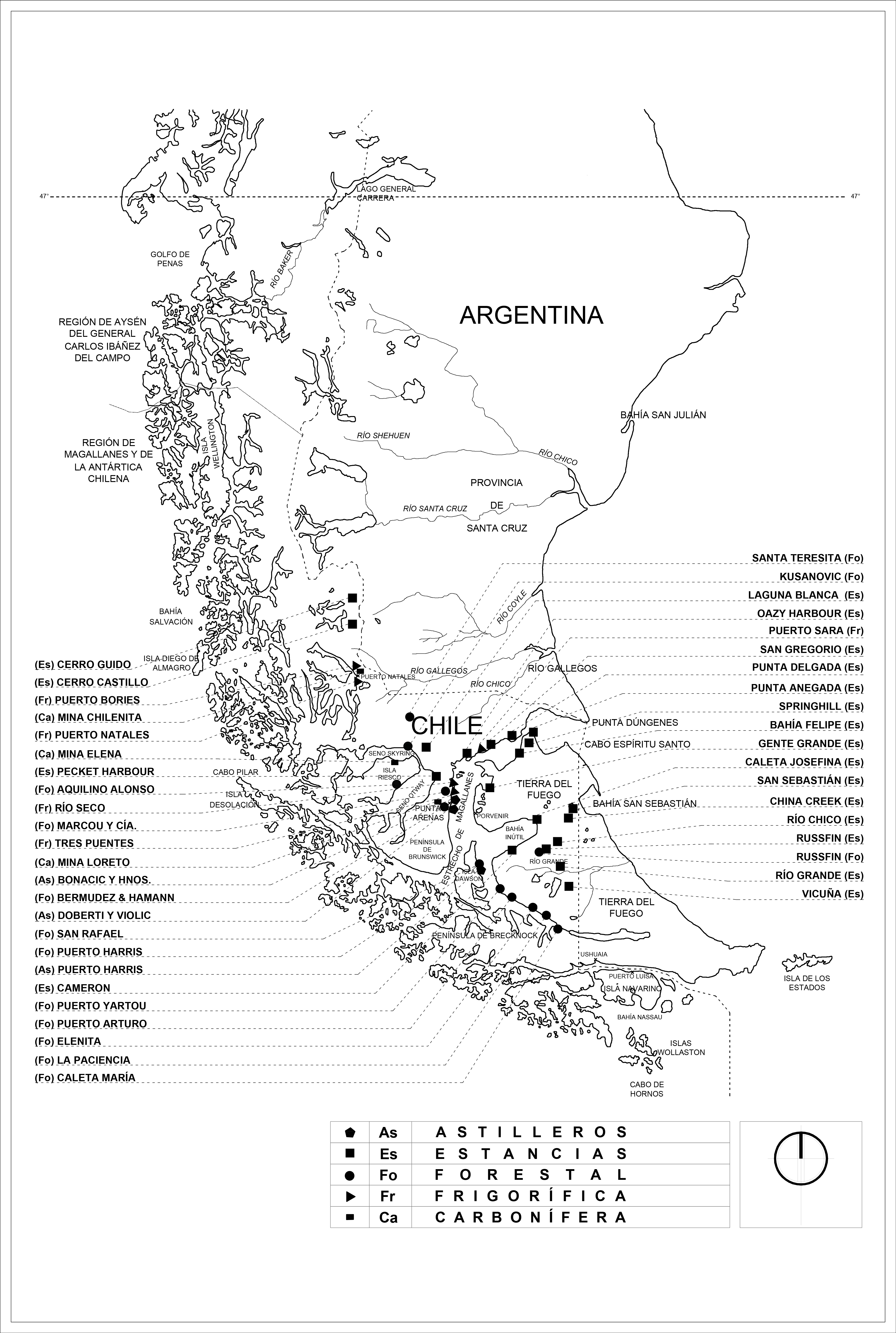 La inexistencia de asentamientos humanos relevantes y de mano de obra, con y sin especializaciones obligó a crear ex-nihilo una serie de enclaves industriales que actuaron como núcleos donde se concentró la mano de obra, dieron soporte a la actividad productiva y constituyeron un vector esencial de un modo de ocupación particular del espacio geográfico continental e insular magallánico.