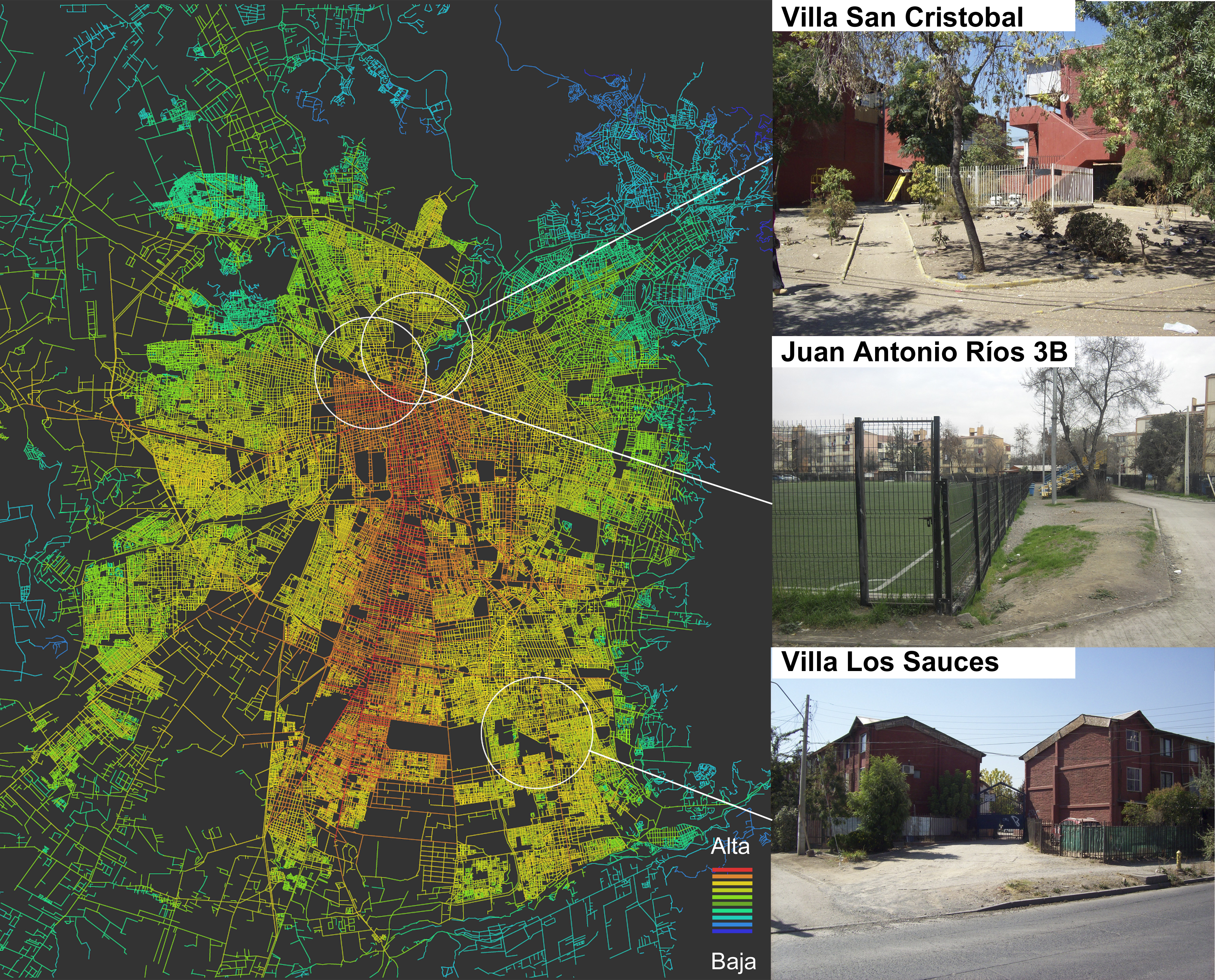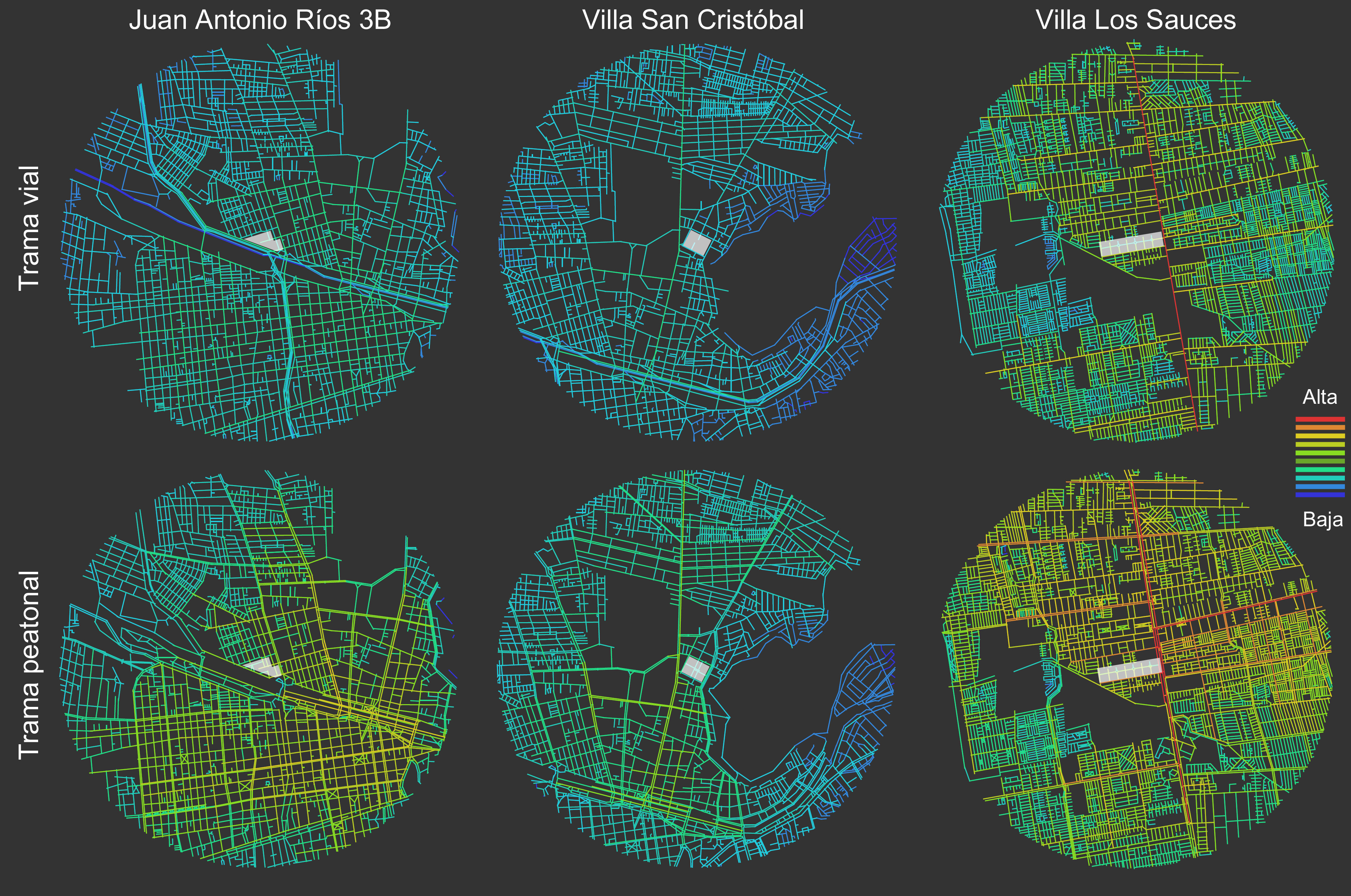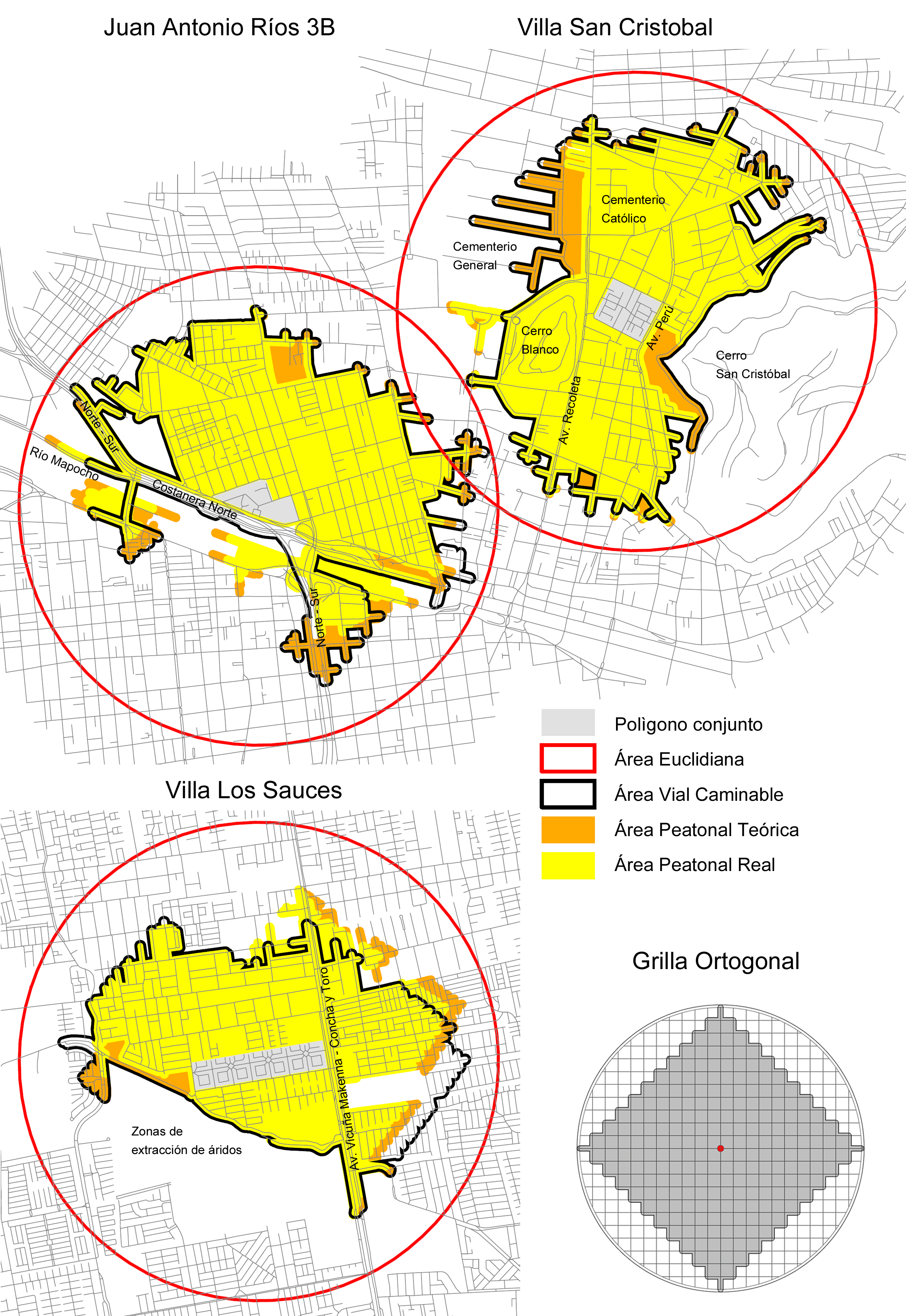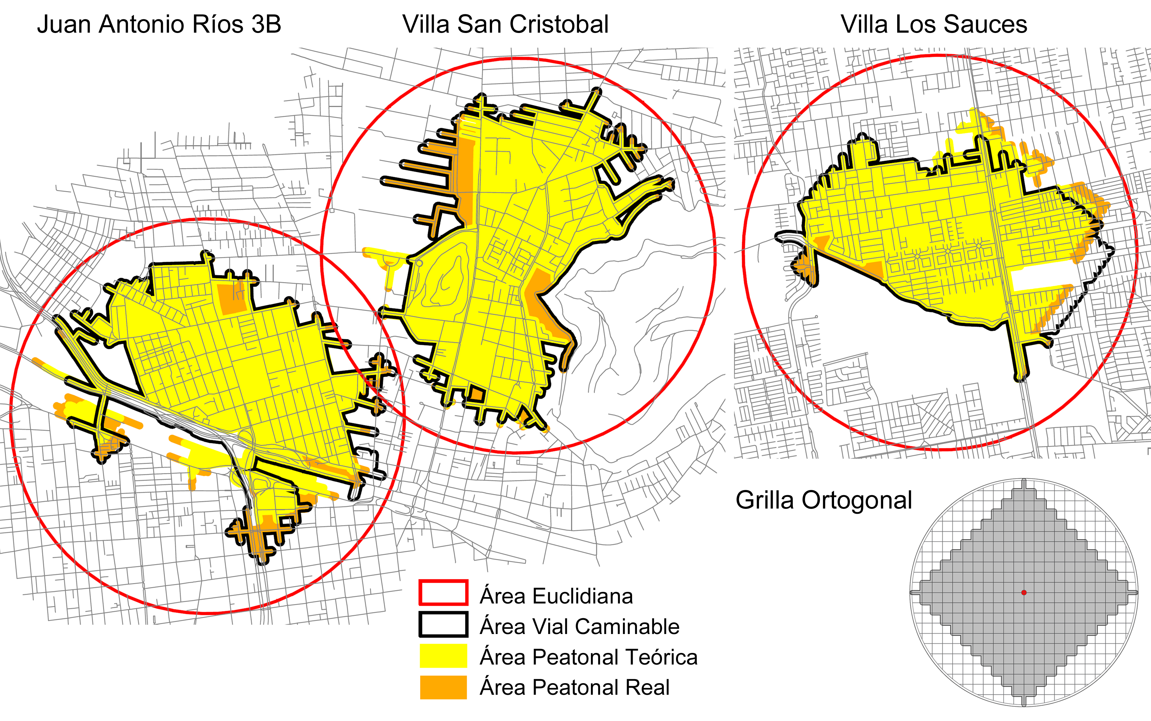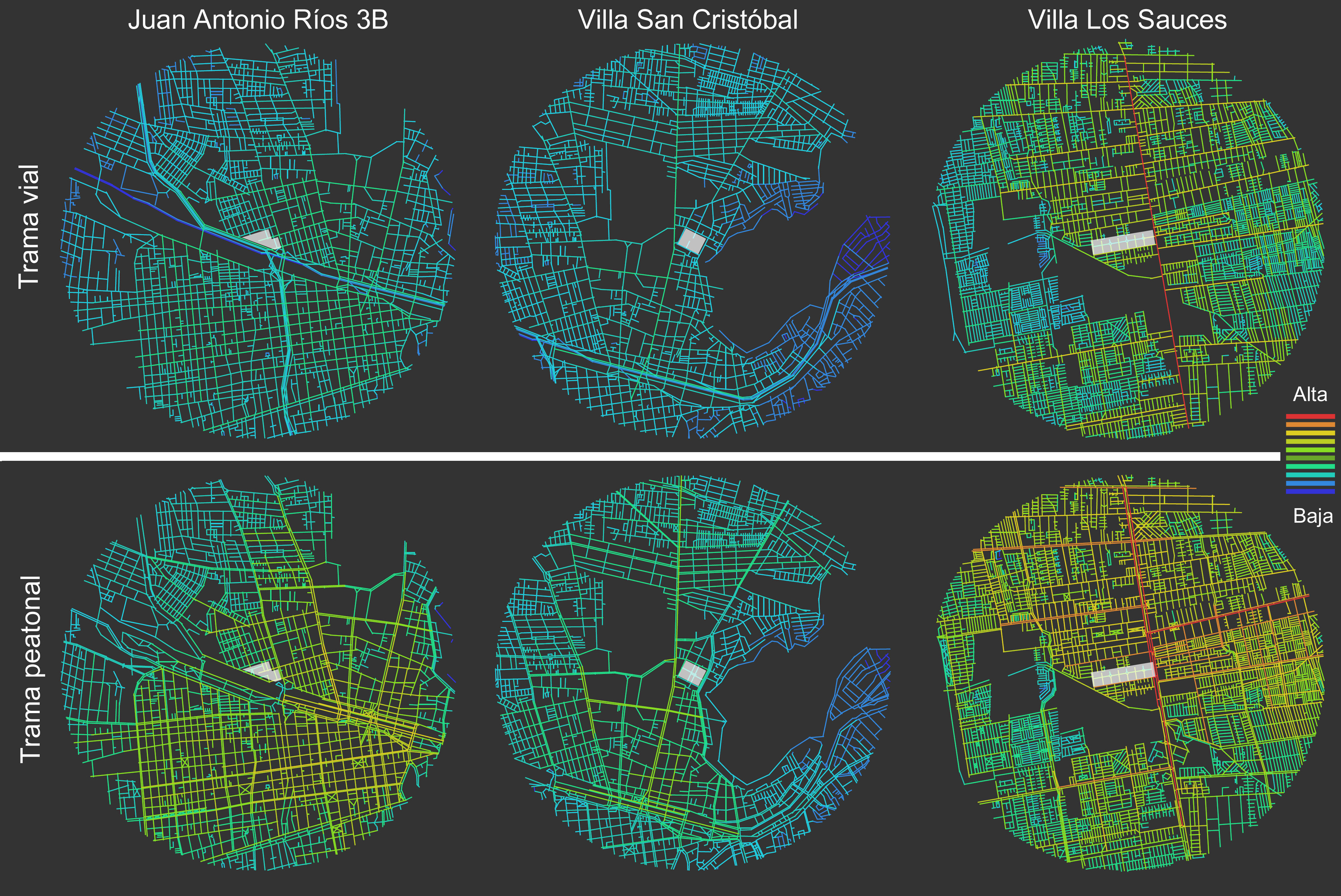 Para cada caso, se identificaron las principales barreras materiales, ya sean naturales (ríos, cerros) o artificiales (carreteras, pasos bajo/sobre nivel) y algunas barreras intangibles (asociadas a la seguridad vial o delictual). Se comparó la superficie teórica máxima del barrio caminable (euclidiana) con la “real” calculada mediante análisis de red (sobre la base de recorridos de 20 min), considerando las condiciones de cruce de las principales vías, cuantificando sus efectos en tiempo y distancia y la consiguiente accesibilidad a equipamiento y servicios. Además, se analizó la configuración de la trama vial y peatonal, contrastando su integración a escala local y global basada en mapas axiales. Finalmente, se analizaron los patrones de movilidad de la población según datos de zona EOD 2012.
