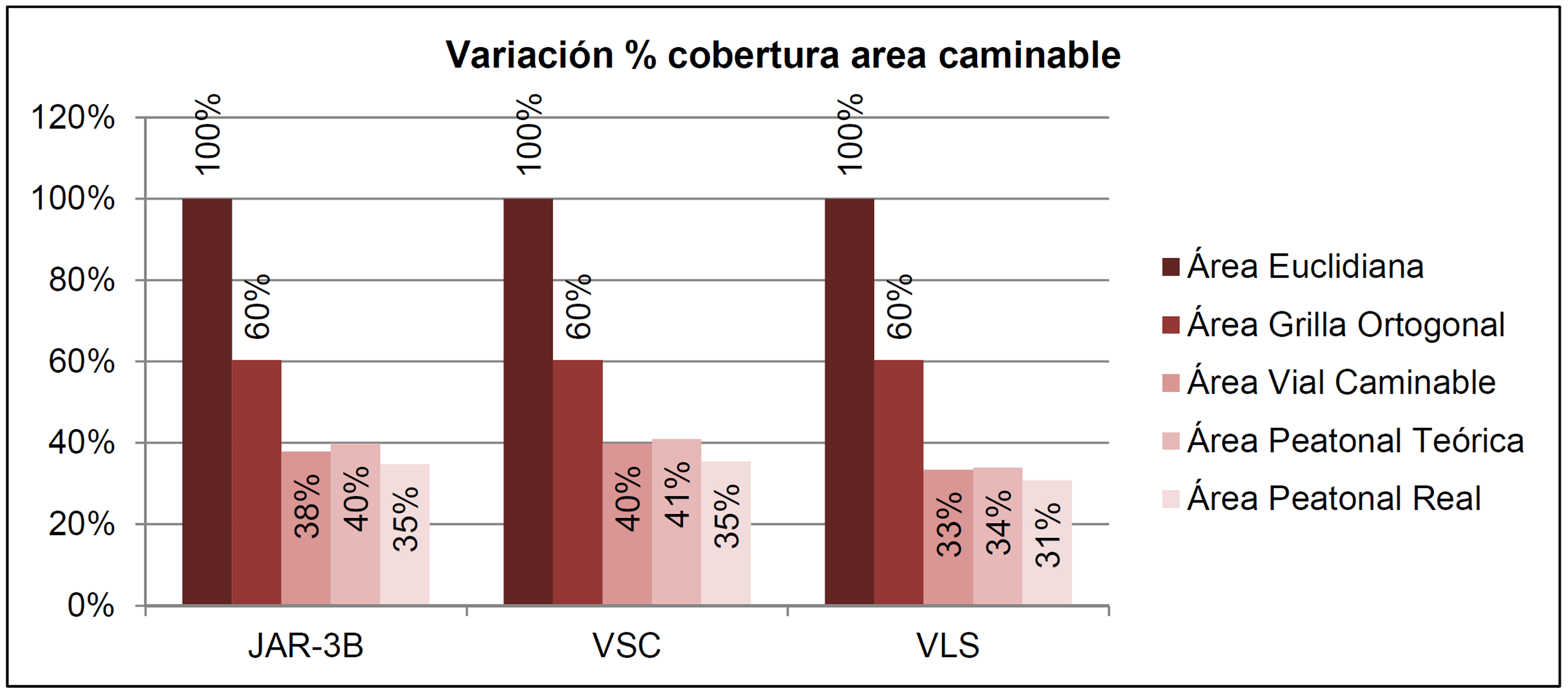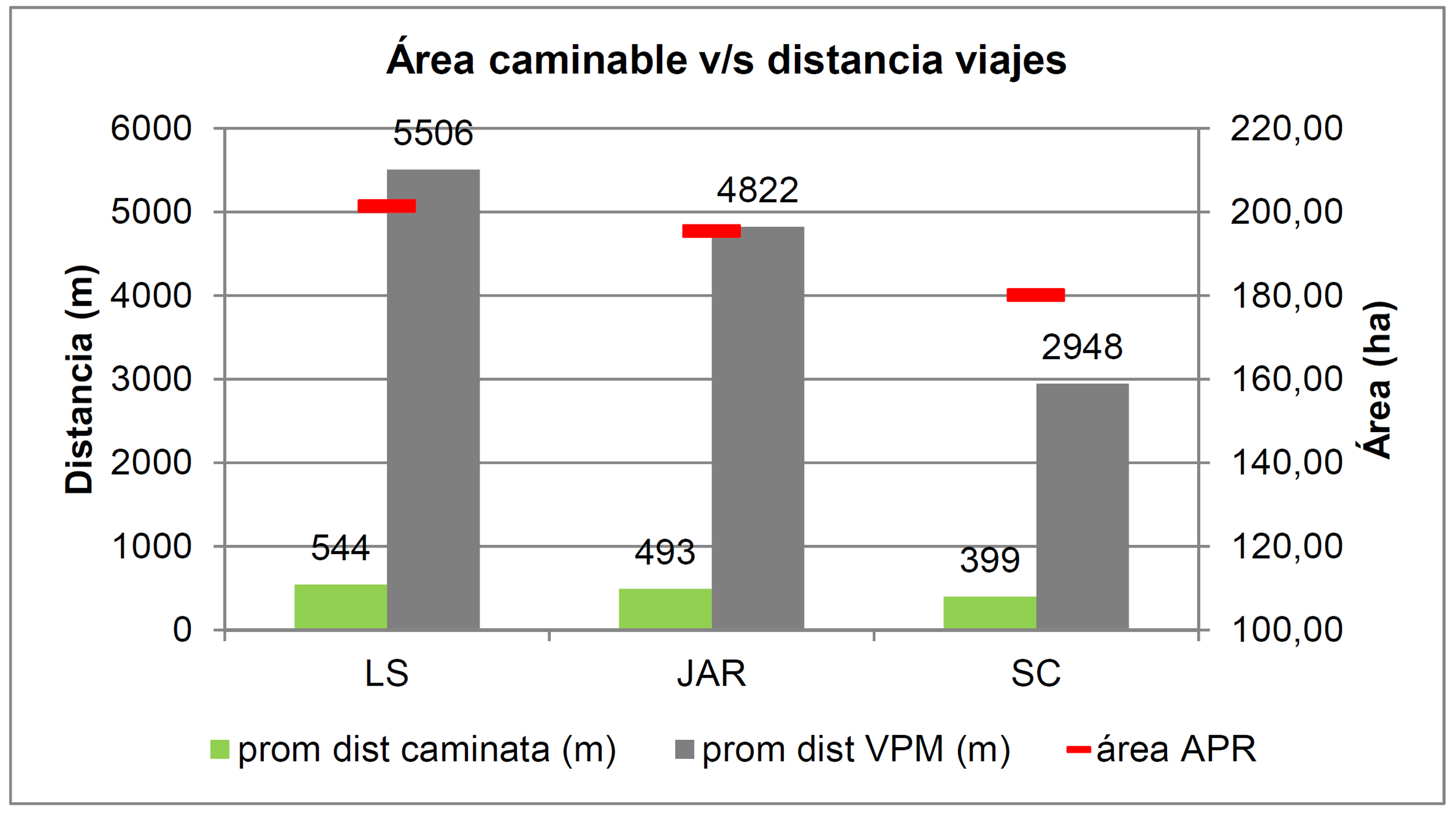 Los resultados muestran una clara disminución del área real del barrio caminable (a un tercio del área euclidiana), producto de la trama y de las diversas barreras existentes, lo que se refleja en la accesibilidad a bienes y servicios vía caminata. Estos resultados permiten proponer además que, si bien una mayor distancia promedio de caminata no se relaciona con una mayor área caminable, la cercanía a centralidades sí se asocia con la prevalencia de este modo de transporte.