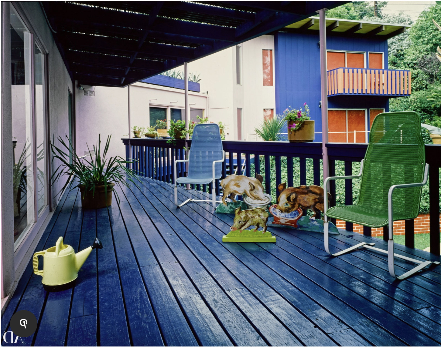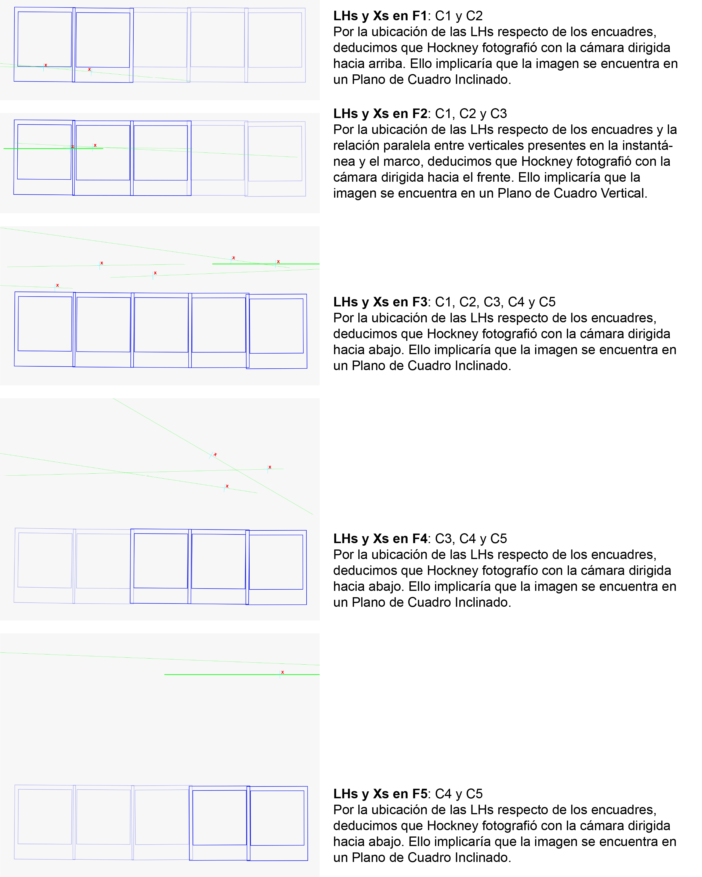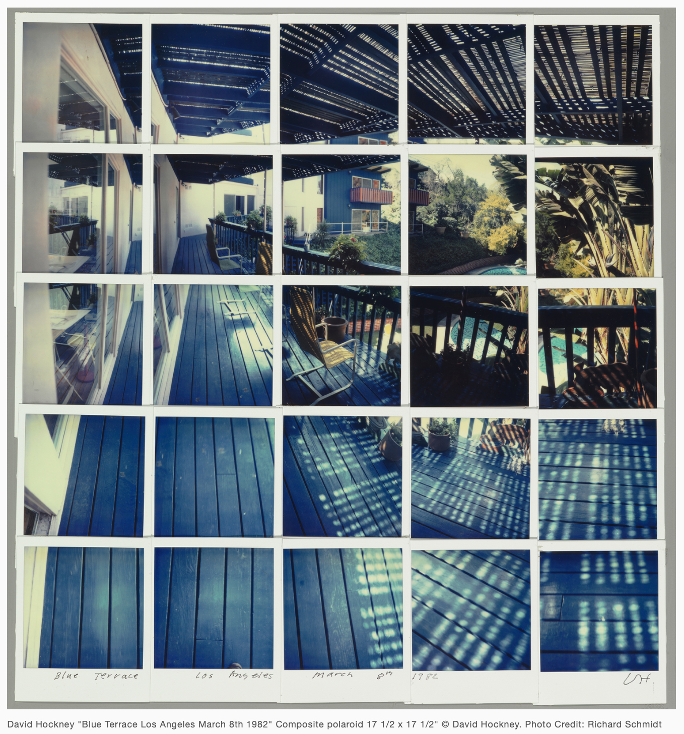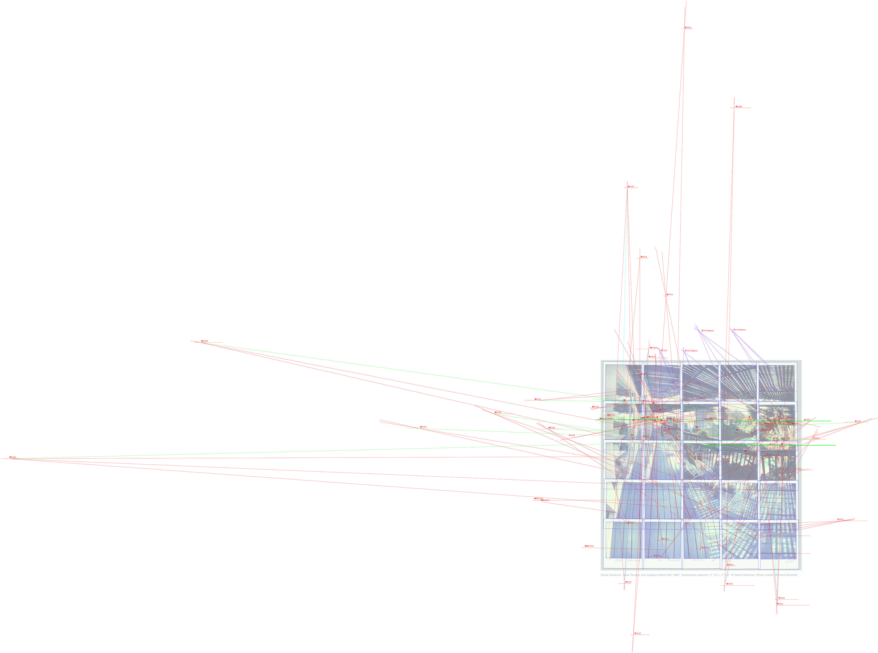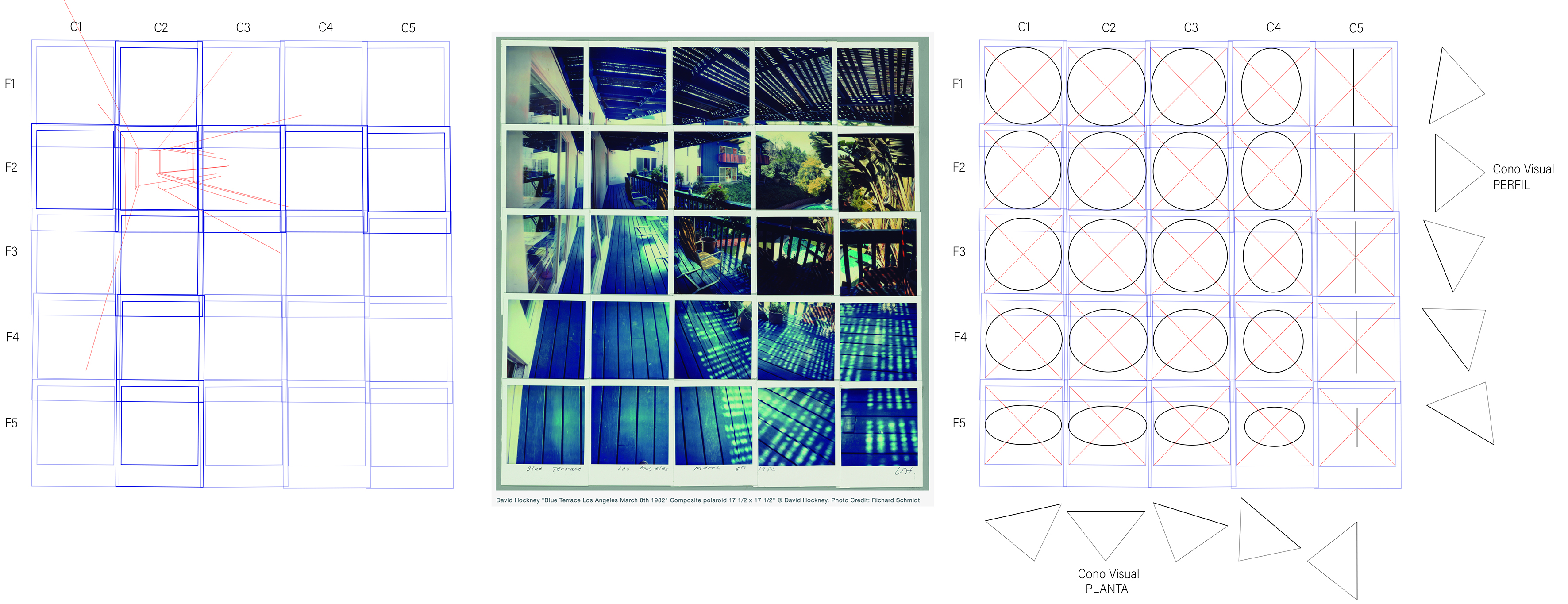 El estudio que emprendemos a partir de la obra “Blue Terrace Los Angeles March 8th 1982” de David Hockney, está motivado por la fascinación que nos provoca la combinación de instantáneas Polaroid o fotografías Réflex que el artista desarrolló en este tipo de obras denominadas Joiners, consistentes en múltiples imágenes fotográficas compuestas en torno a un motivo, operatoria mediante la cual se intenta crear y comunicar sobre la percepción del espacio y el tiempo (De ARCH, 2016). La introducción de descalces en las distancias, diferencias de puntos de vista y encuadres entre tomas para un motivo determinado, presenta el despliegue temporal en la imagen recompuesta, cuestionando la instantaneidad de la fotografía. Esta obra específica ofrece la oportunidad de estudiar la restitución perspectiva de las imágenes fotográficas que la componen, toda vez que el análisis se aborda como proyecciones en el plano de cuadro para develar la performance de Hockney frente a este motivo.