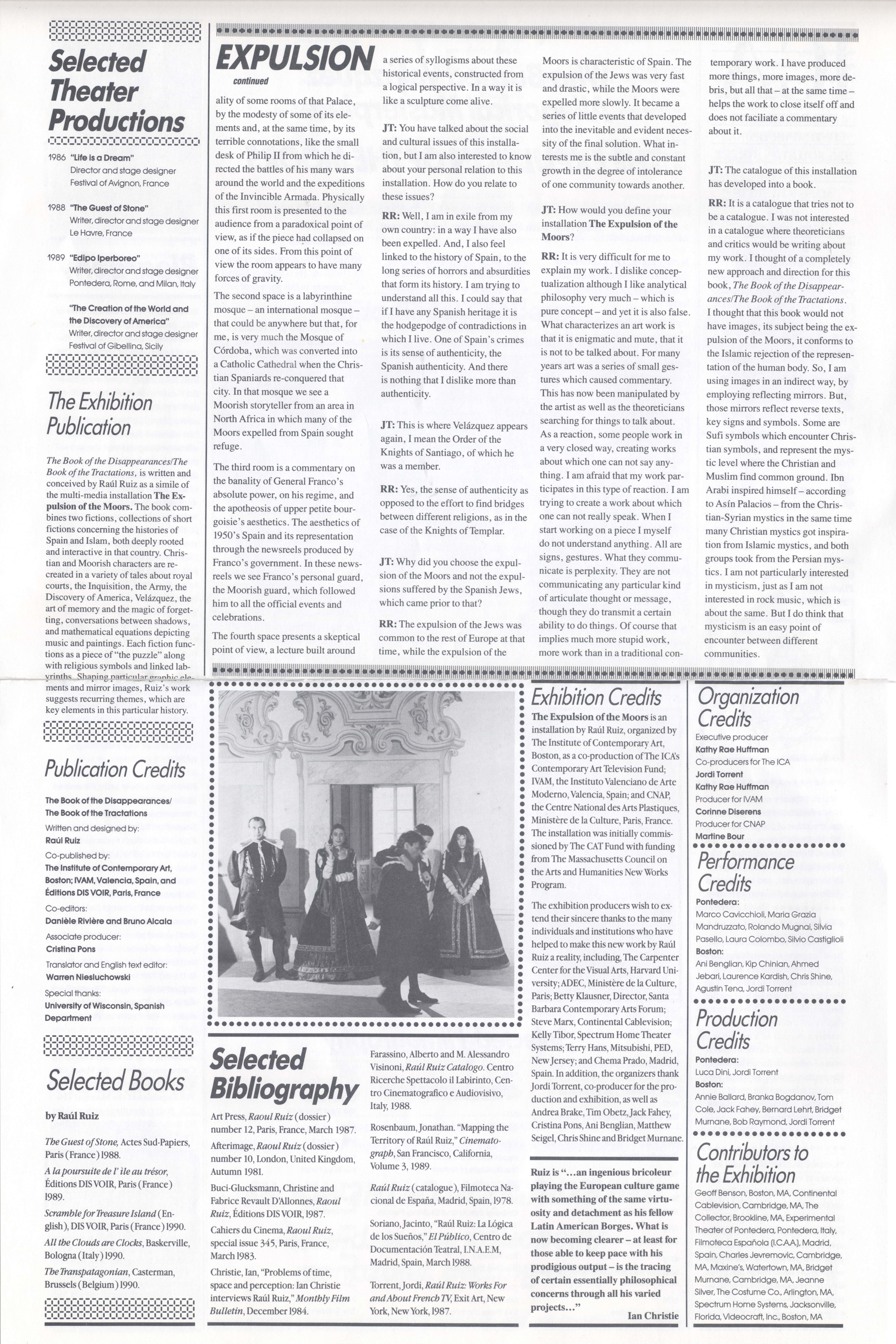 A partir de un trabajo con archivos y entrevistas, el presente ensayo recupera la instalación titulada La expulsión de los moros (1990) del cineasta chileno Raúl Ruiz, que define una política de la representación y del espectador, desde del cuestionamiento de la experiencia de la alteridad. Para ello, se comenta la operación de la investigación realizada con los documentos, la visualidad de la instalación a partir de sus imágenes y materialidades, y una teoría del espectador en diálogo con su cine y sus Poéticas del cine (2013). Finalmente, a modo de conclusión, se proponen algunas consideraciones en torno a las relaciones especulativas, interdisciplinarias e intermediales entre cine y artes visuales, y respecto de una “arqueología de la mirada”, que es la que realiza Ruiz mediante esta exposición y de la que la presente investigación participa por medio de su ejercicio documental.